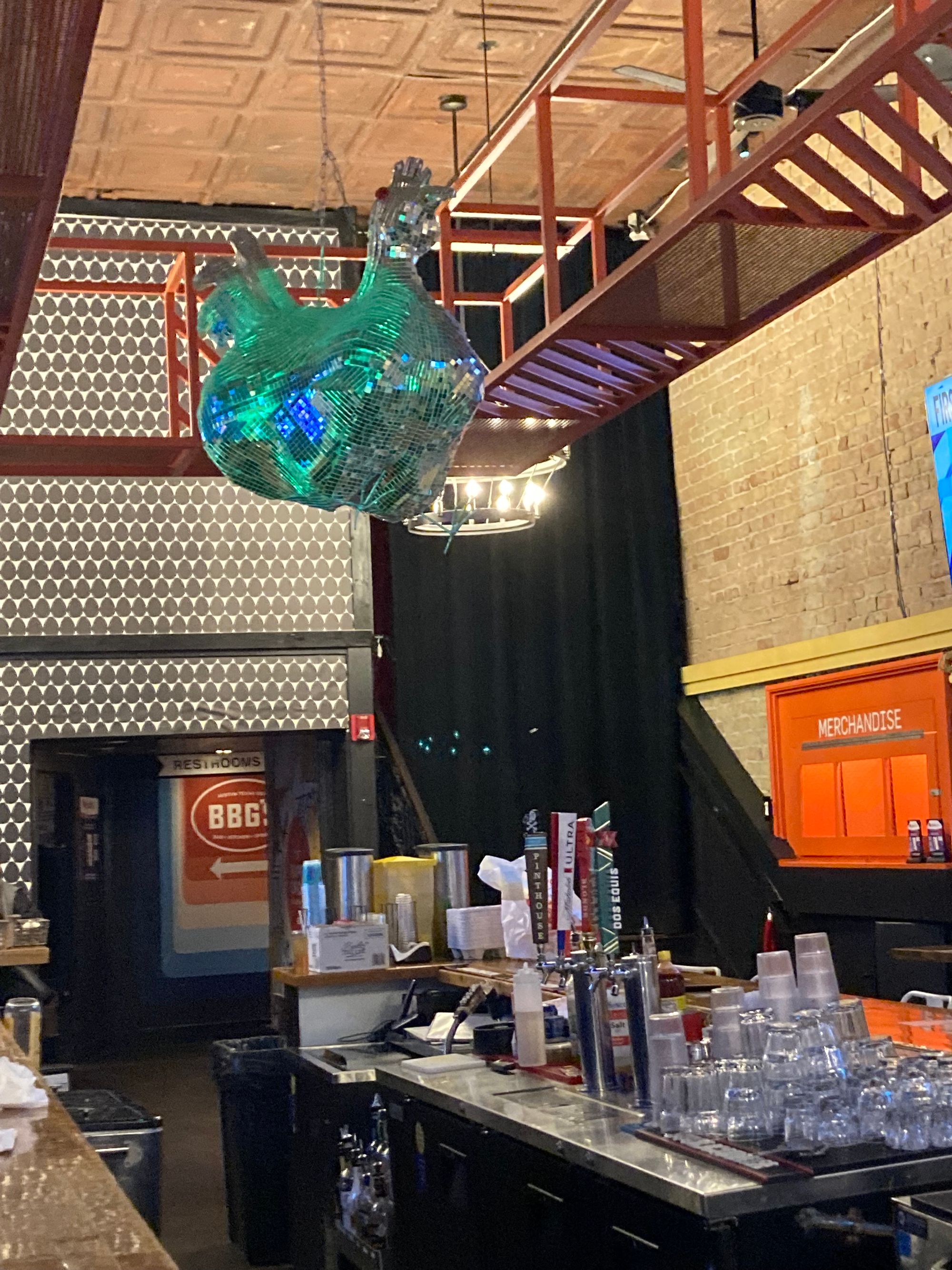 Downtown texas, are there a lot of cool things and people? yeah.. probably, what do you get? a picture of this, Giant fucking disco chicken.